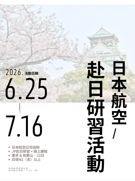日本航空公司協辦之「2026 年 JAL SCHOLARSHIP 日本研究 PROGRAM」,將甄選優秀大學生參與線上研習及赴日研習活動,歡迎符合資格之同學踴躍報名。