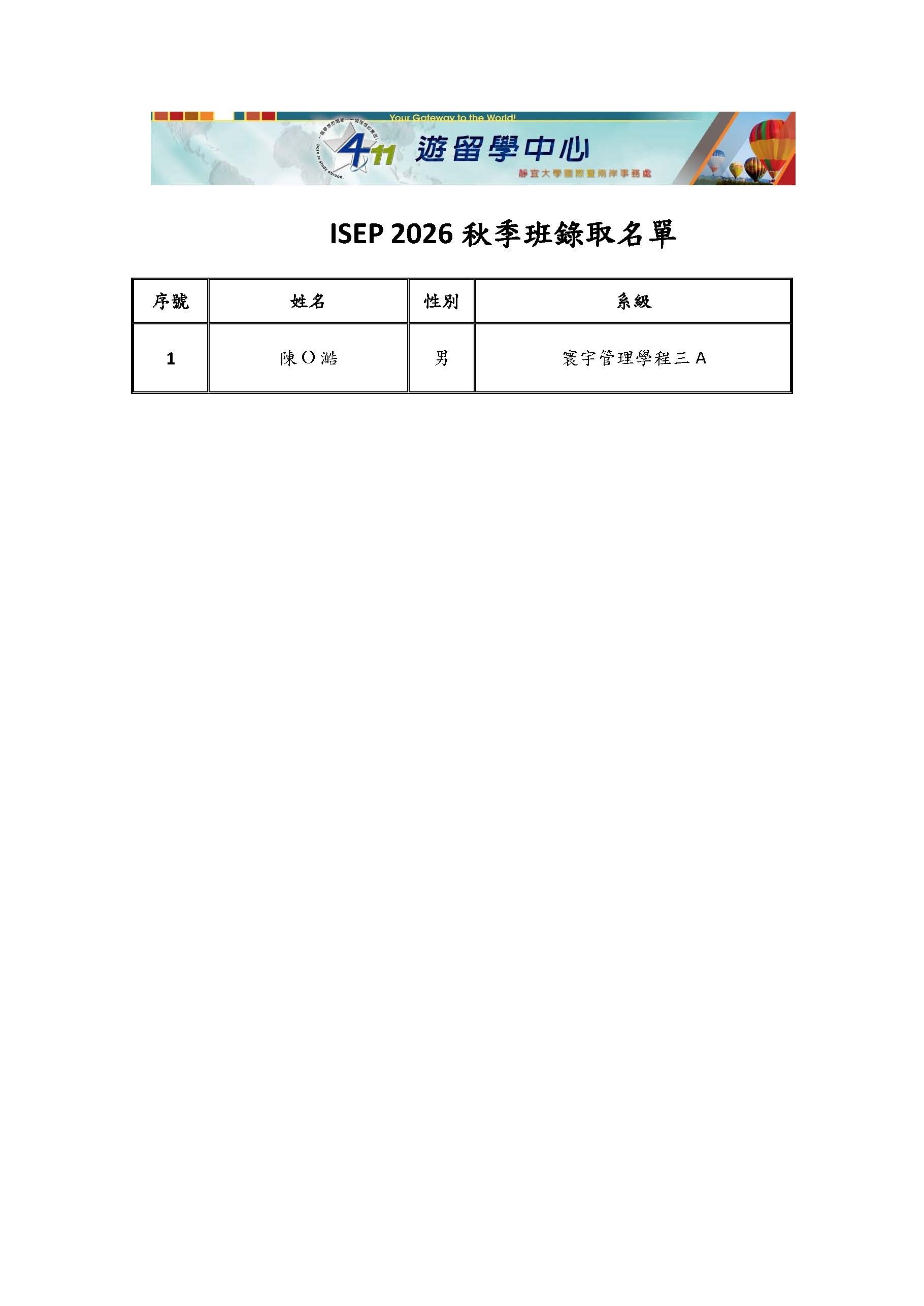 🎊恭喜以下同學被選為2026 秋季班 ISEP 交換學生!🎊